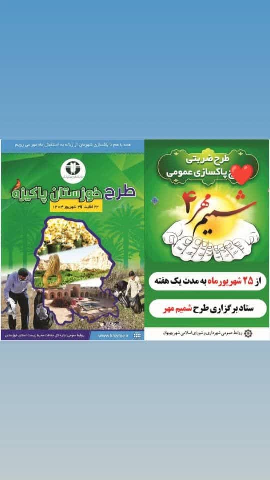 ✅اجرای همزمان طرح ضربتی ب س ی ج، پاکسازی عمومی ،شمیم مهر ۴ و طرح خوزستان پاکیزه ، با حضور مدیران اجرایی شهرستان و سپس عملیات های پاک سازی و سایر خدمات شهری توسط ماشین آلات و نیروهای تحت امر انجام خواهد شد ،