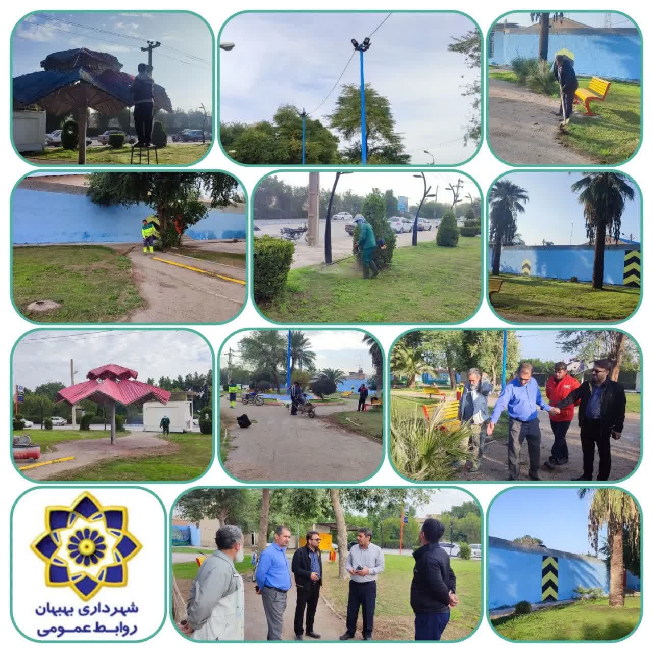 🔽همچنین معاونت خدمات شهری شهرداری بهبهان در این راستا افزود که اقدامات شایانی همانند رنگ آمیزی ،نور پردازی ،توسط نیروهای زیبا سازی ،اصلاح ،هرس،گل کاری و چمن زنی و تنظیف نیروهای فضای سبز و خدمات شهری شهرداری بهبهان صورت گرفت و تمام تلاش ما در این زمینه بهره برداری صحیح و خصوصا نگهداری آن می‌باشد .