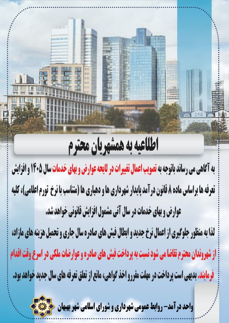 به آگاهی می رساند باتوجه به تصویب اعمال تغییرات در لایحه عوارض و بهای خدمات سال ۱۴۰۵ و افزایش تعرفه ها براساس ماده ۸ قانون درآمد پایدار شهرداری ها و دهیاری ها (متناسب با نرخ تورم اعلامی)، کلیه عوارض و بهای خدمات در سال آتی مشمول افزایش قانونی خواهد شد.