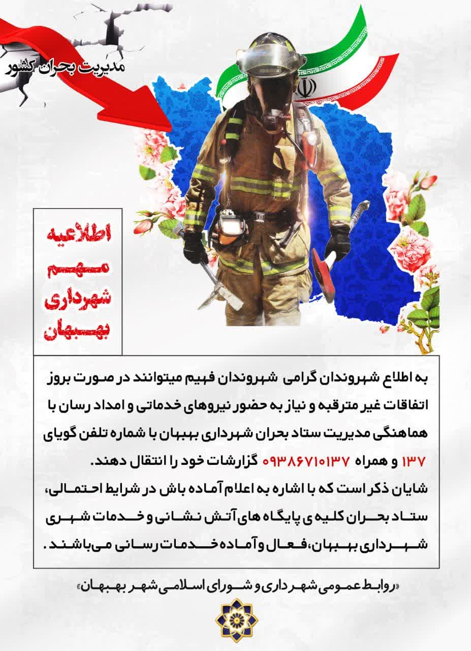 🔽به اطلاع شهروندان گرامی شهروندان فهیم میتوانند در صورت بروز اتفاقات غیر مترقبه و نیاز به حضور نیروهای خدماتی و امداد رسان با هماهنگی مدیریت ستاد بحران شهرداری بهبهان با شماره تلفن گویای ۱۳۷و شماره همراه ۰۹۳۸۶۷۱۰۱۳۷ گزارشات خود را انتقال دهند.
