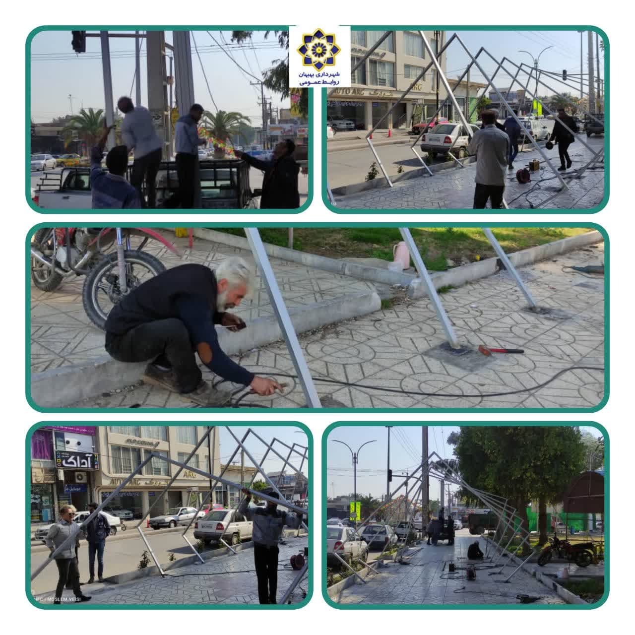 روند اجرایی نصب تونل نوری در پیاده روی باغ ملی توسط نیروهای حوزه زیباسازی شهرداری بهبهان