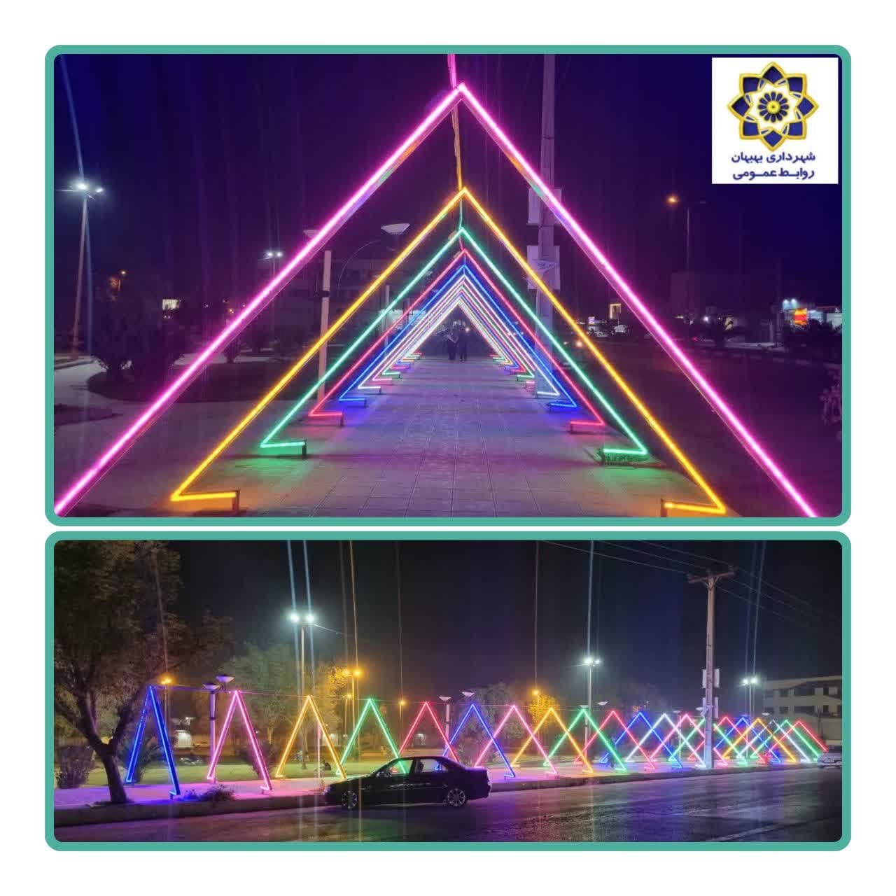 نمایی زیبا از اجرای دومین ،تونل نوری و فضاسازی محیطی در پیاده رو ،پارک شهید فضلی نژاد در نزدیکی مجموعه فرهنگسرای حاج محمود بهبهانیان ،توسط مجموعه زیباسازی شهرداری بهبهان در راستای استقبال از بهار