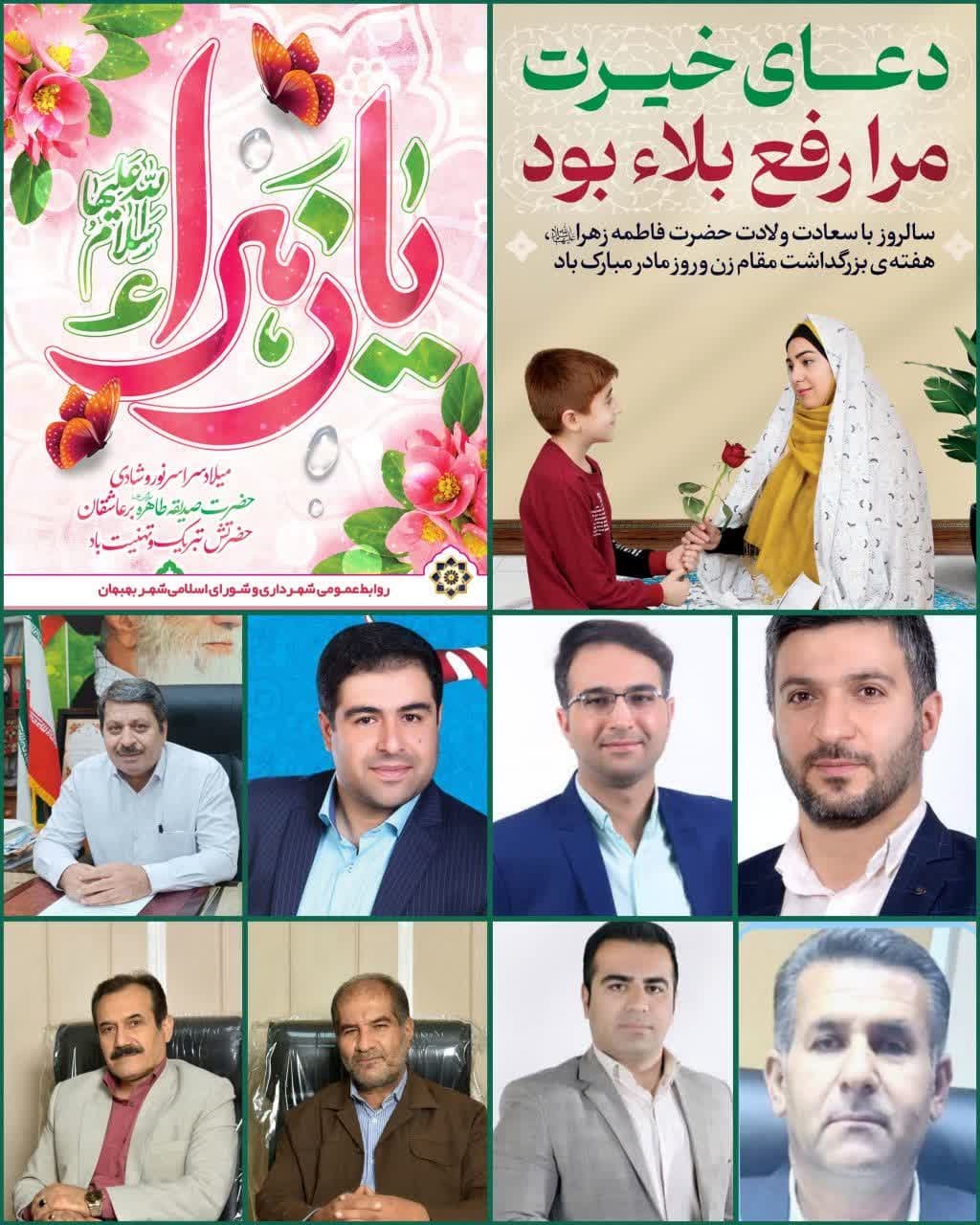 🔽مایه مباهات است که این روز فرخنده را محضر یگانه منجی عالم بشریت حضرت مهدی(عج)، عموم مسلمین جهان، بویژه بانوان فداکار، مادران شهدا، خاصه همکاران گرامی در مجموعه شهرداری و شورای اسلامی شهر ،بانوان فهیم، مؤمنه و دوستدار حضرت زهرا(س) تبریک و تهنیت عرض نموده و از خداوند سبحان، توفیق پیروی و اطاعت از منویات آن بانوی با کرامت را خواستاریم.