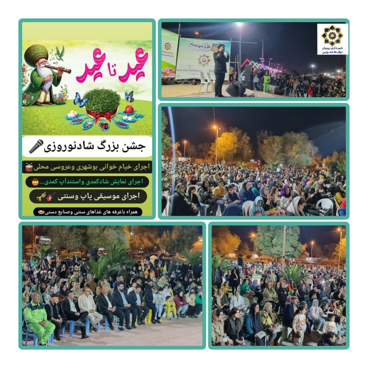 🔽جشن بزرگ شاد نوروزی (عید تا عید ) بمناسبت عید باستانی نوروز و عید سعید فطر در شامگاه شنبه مورخه نهم فروردین ماه ۱۴۰۴ در پارک شهید فضلی نژاد جنب فرهنگسرای بهبهانیان توسط مجموعه روابط عمومی شهرداری که با همت و همکاری لازم شهردار و معاونت اداری مالی ، اعضای شورای اسلامی شهر بهبهان جهت شادی و نشاط مردم شریف و مسافرین نوروزی ،تدارک دیده شده بود ،با اجرای نمایش های کمدی ،خیام خوانی ،موسیقی پاپ و سنتی،اجرای عروسی محلی و همراه با غرفه های غذاهای سنتی و صنایع دستی ،برگزار شد.