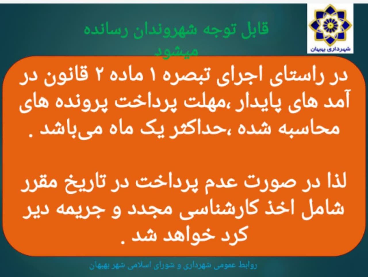 🔽در راستای اجرای تبصره ۱ ماده ۲ قانون در آمد های پایدار ،مهلت پرداخت پرونده های محاسبه شده ،حداکثر (یک ماه) میباشد .