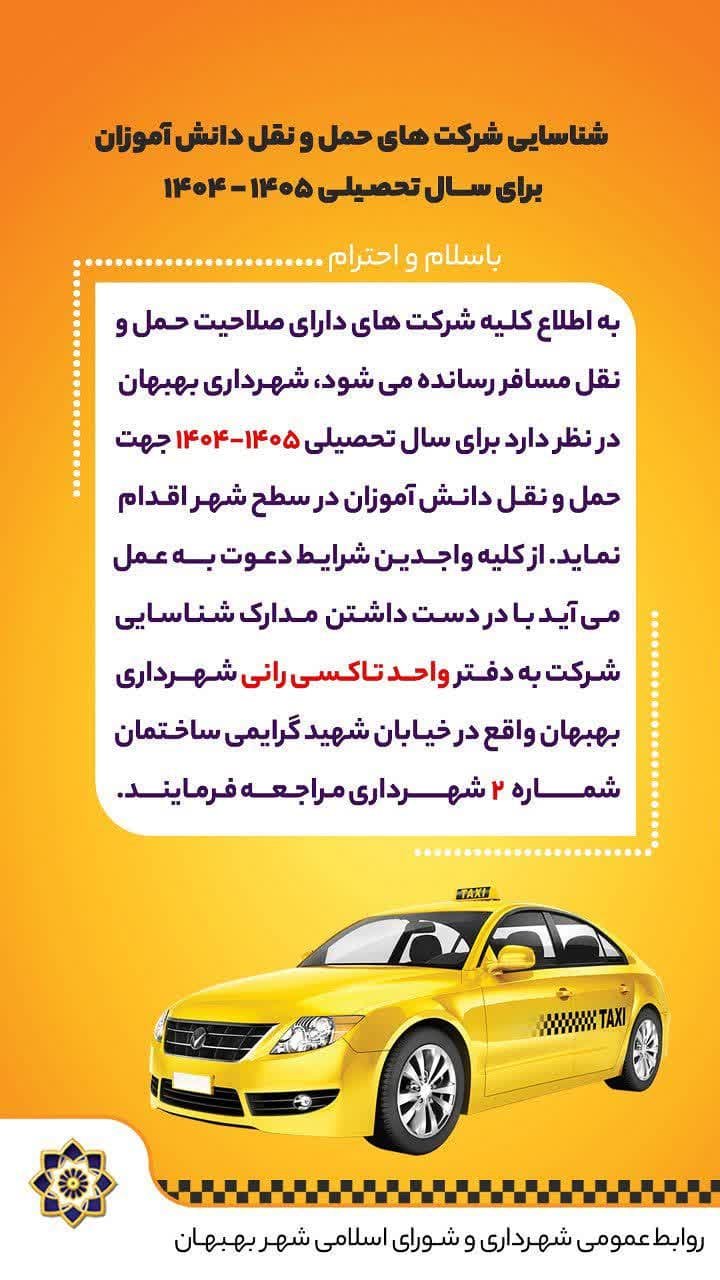 🔽به اطلاع کلیه شرکت های دارای صلاحیت حمل و نقل مسافر رسانده می شود، شهرداری بهبهان در نظر دارد برای سال تحصیلی 1405-1404 جهت حمل و نقل دانش آموزان در سطح شهر اقدام نماید. از کلیه واجدین شرایط دعوت به عمل می آید با در دست داشتن مدارک شناسایی شرکت به دفتر واحد تاکسی رانی شهرداری بهبهان واقع در خیابان شهید گرایمی ساختمان شماره 2 شهرداری مراجعه فرمایند.