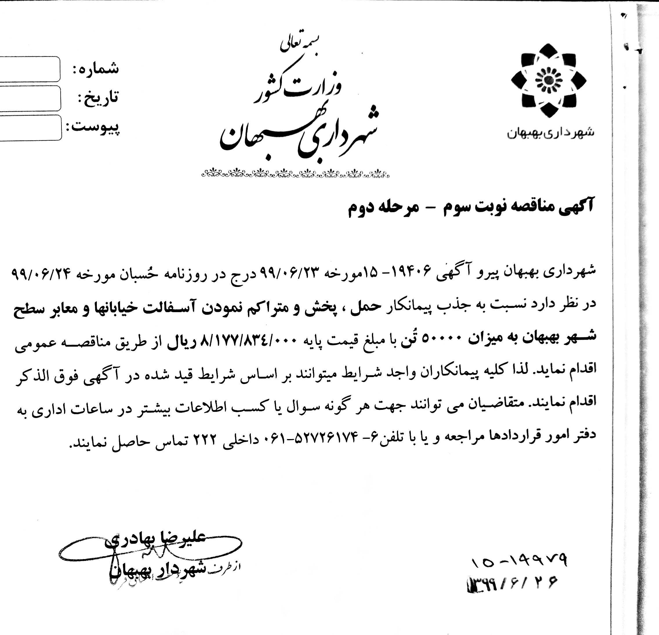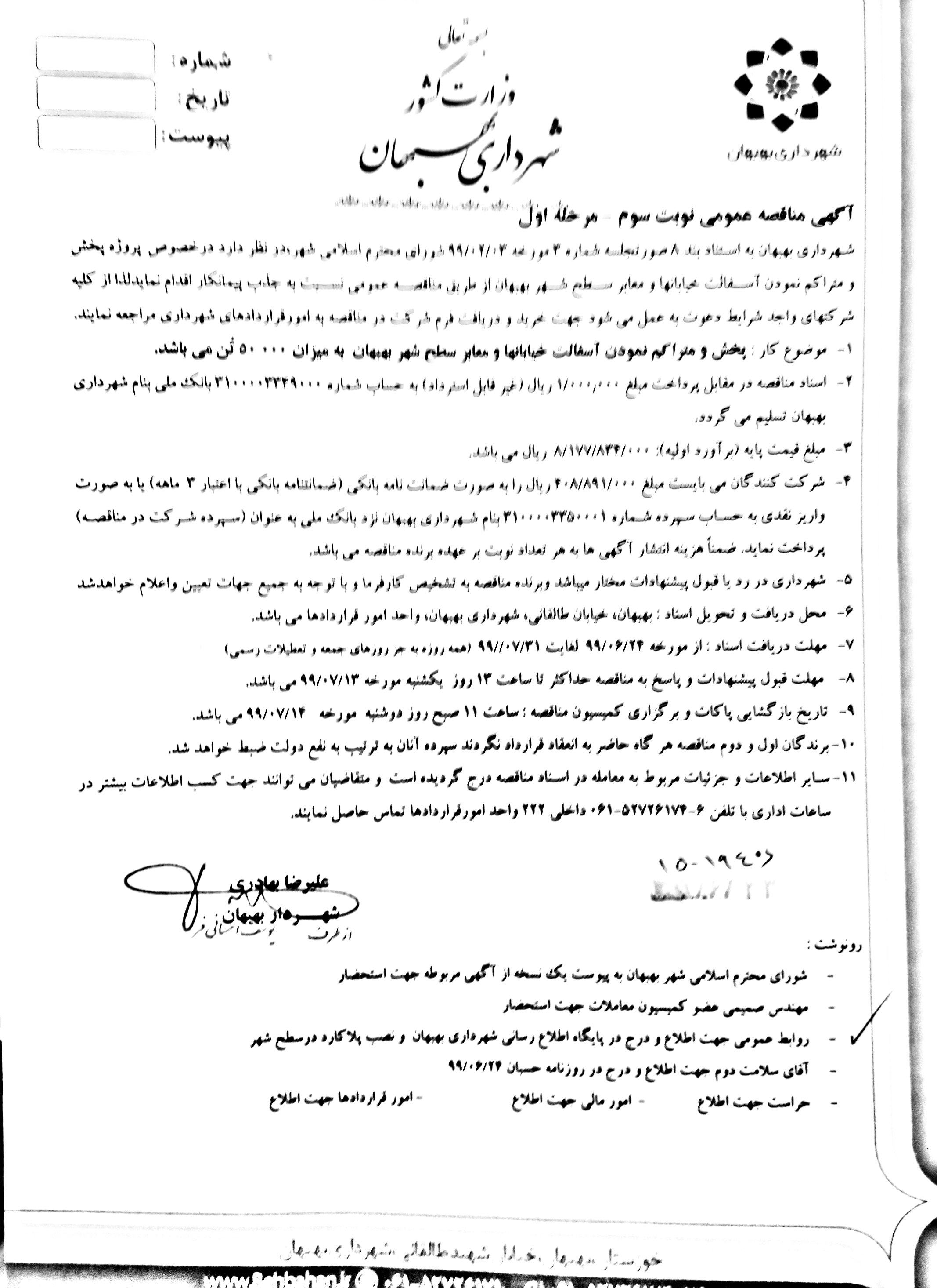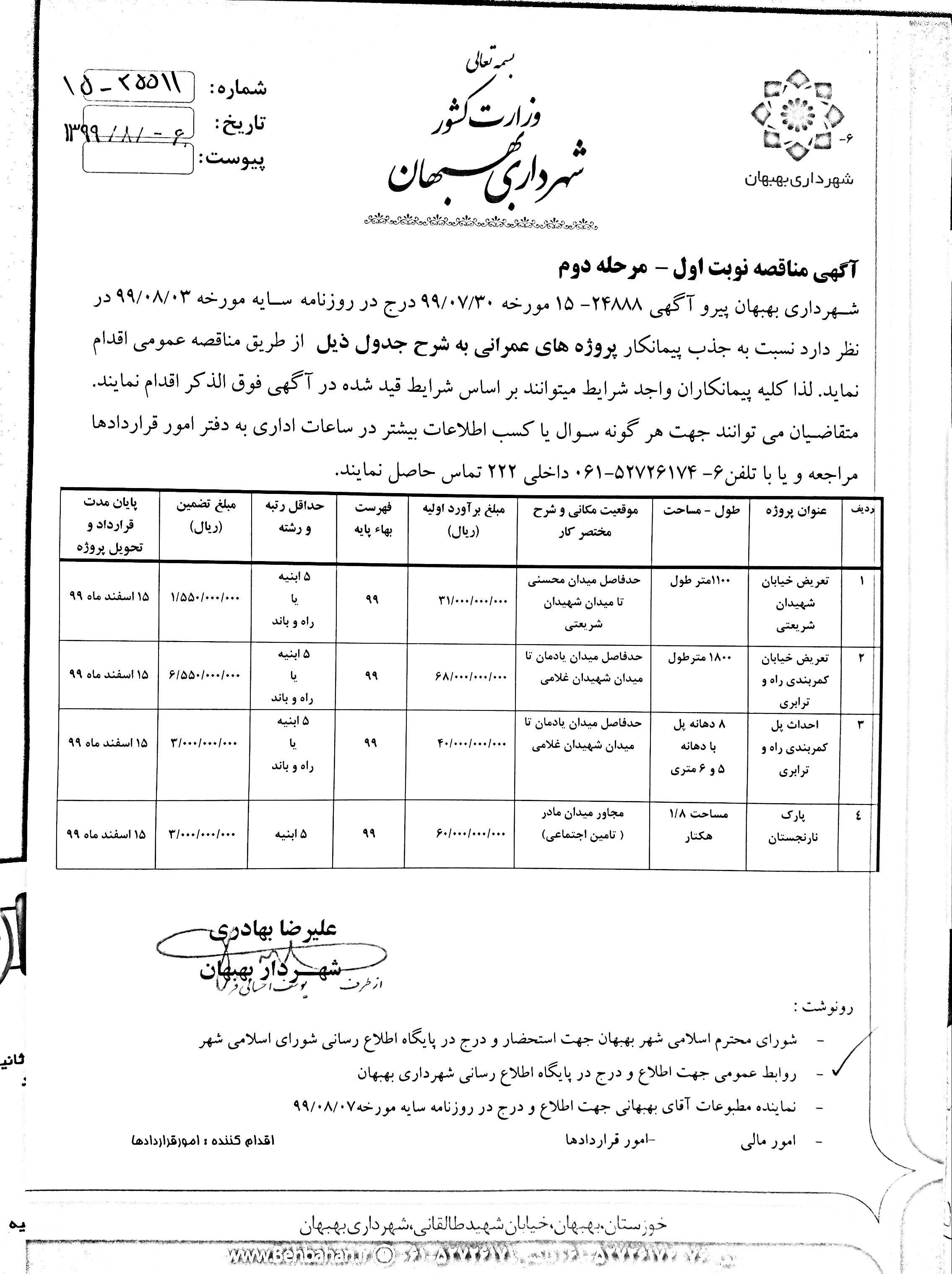 آگهی مناقصه نوبت دوم – مرحله دومAdmin7 آبان 1399 آگهی مناقصه نوبت اول – مرحله دوم شهرداری بهبهان پیرو آگهی 24888– 15 مورخه 30/07/99 درج در روزنامه سایه مورخه 03/08/99 در نظر دارد ... ادامه مطلب