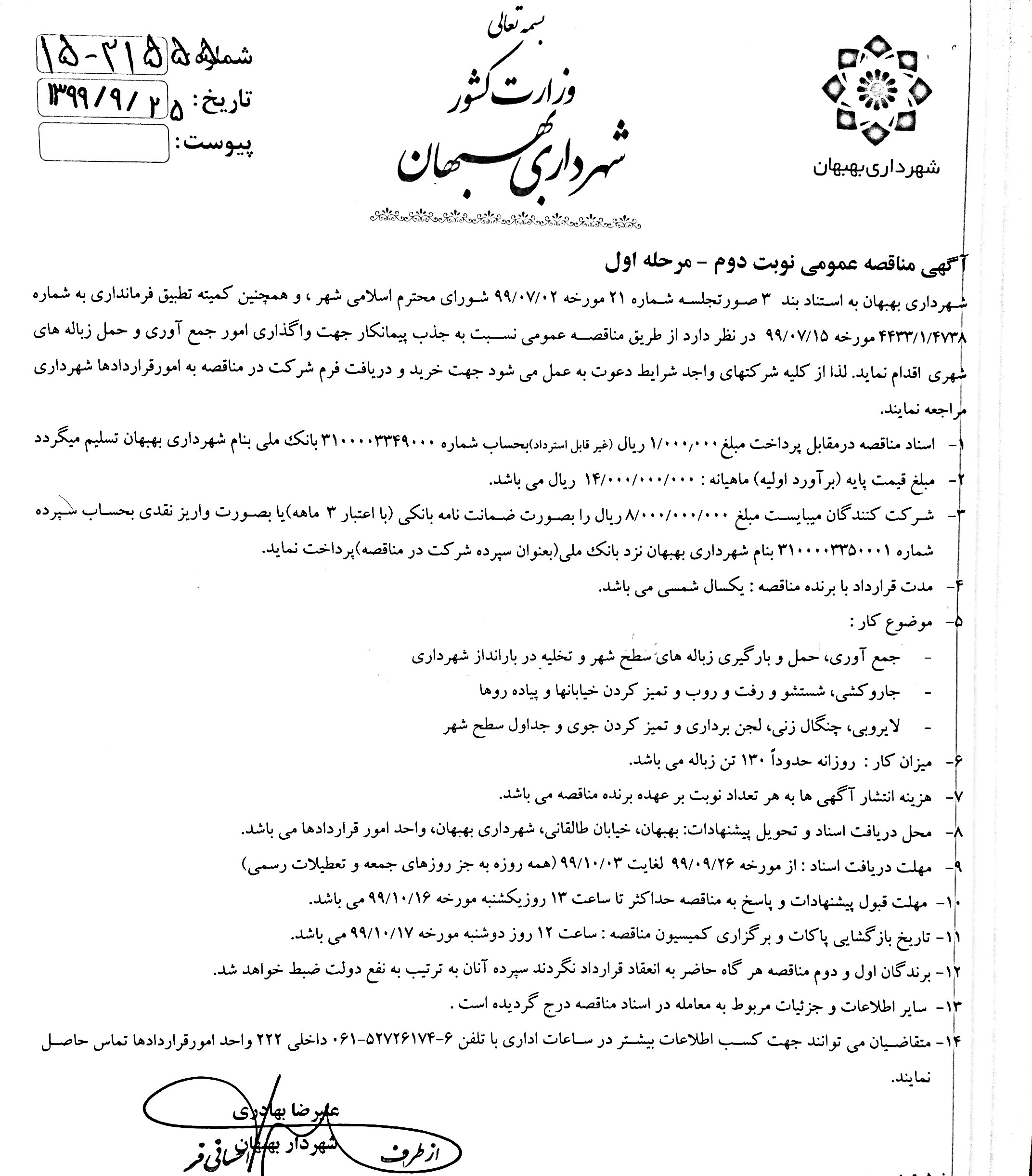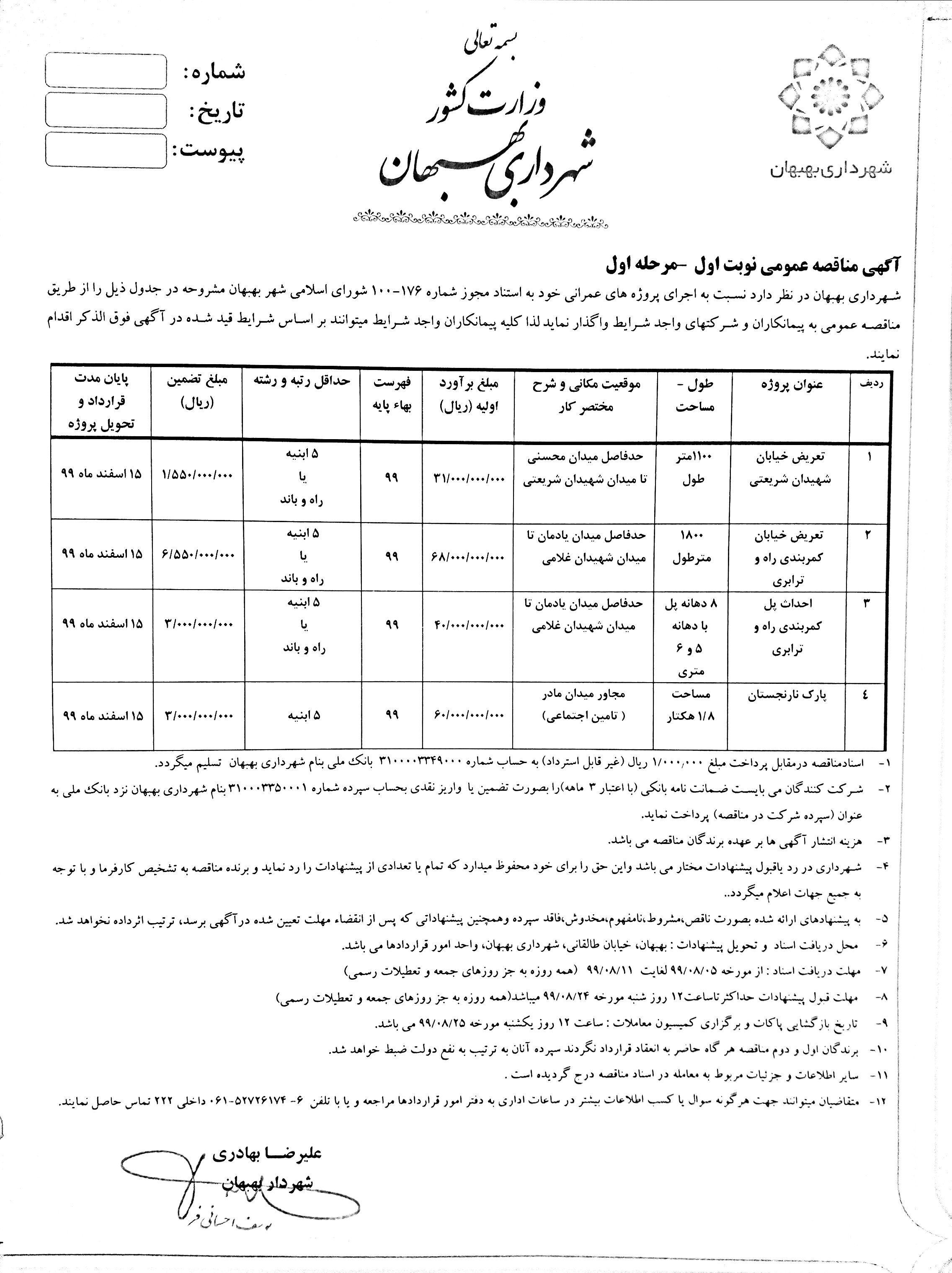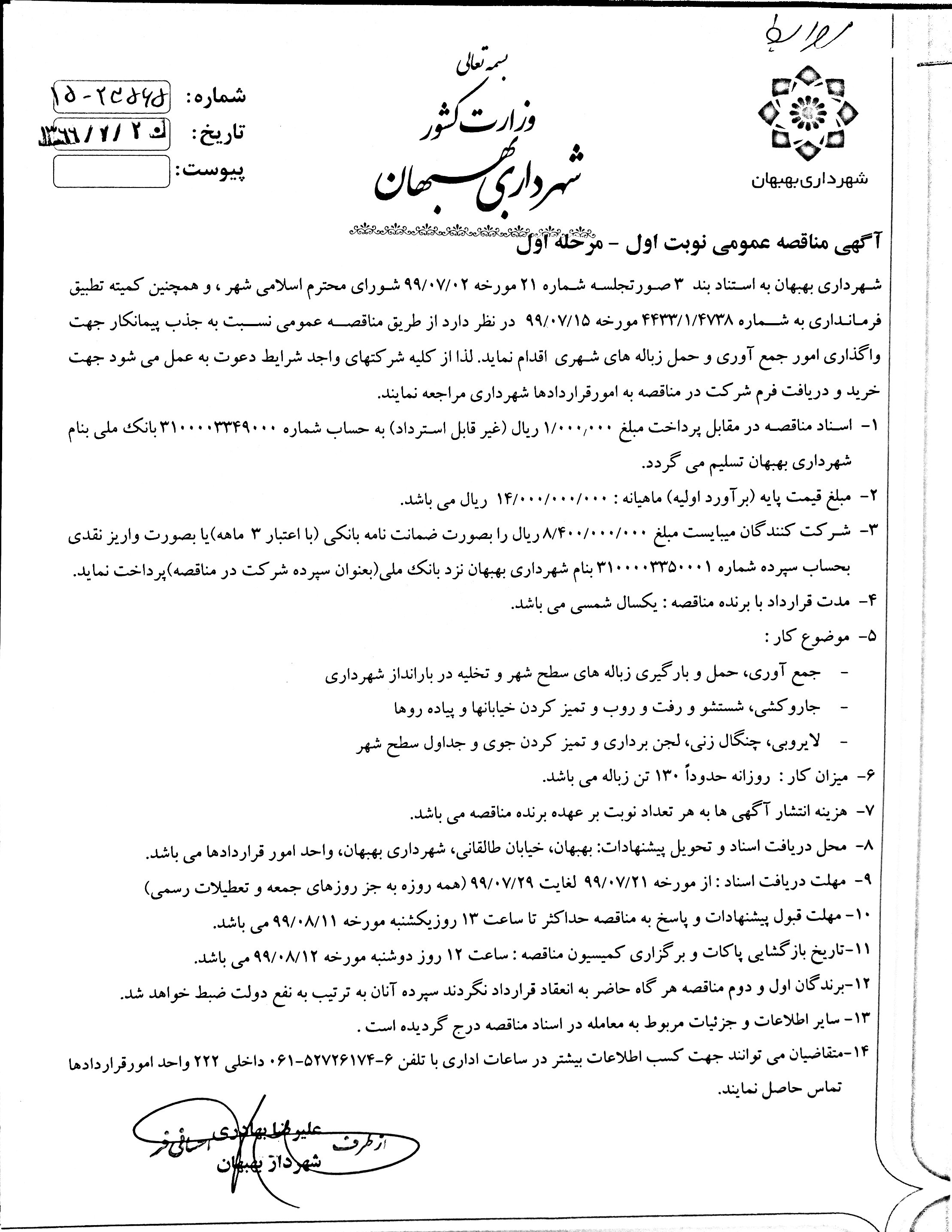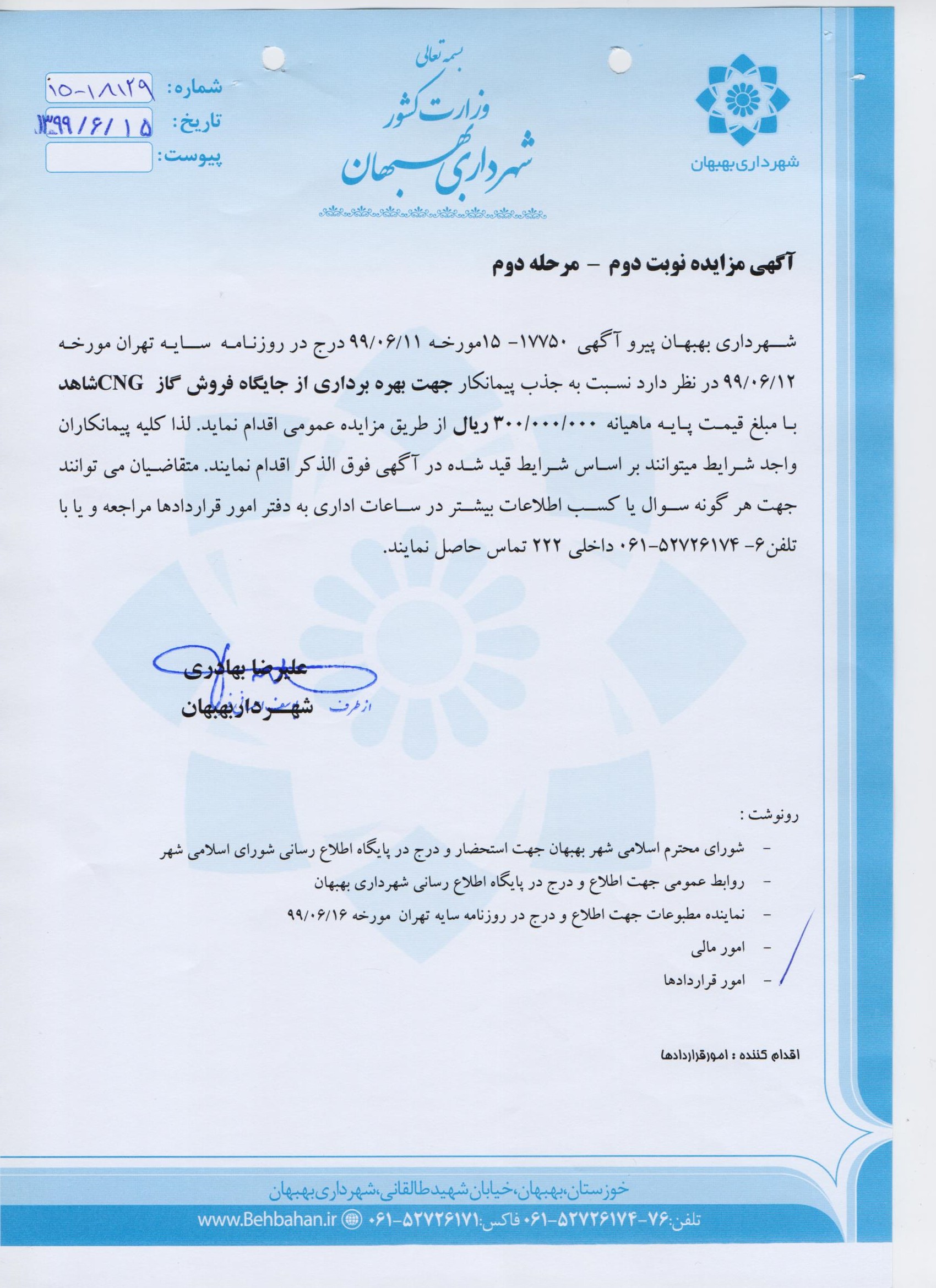 آگهی مناقصه نوبت دوم – مرحله دومAdmin7 آبان 1399 آگهی مناقصه نوبت اول – مرحله دوم شهرداری بهبهان پیرو آگهی 24888– 15 مورخه 30/07/99 درج در روزنامه سایه مورخه 03/08/99 در نظر دارد ... ادامه مطلب