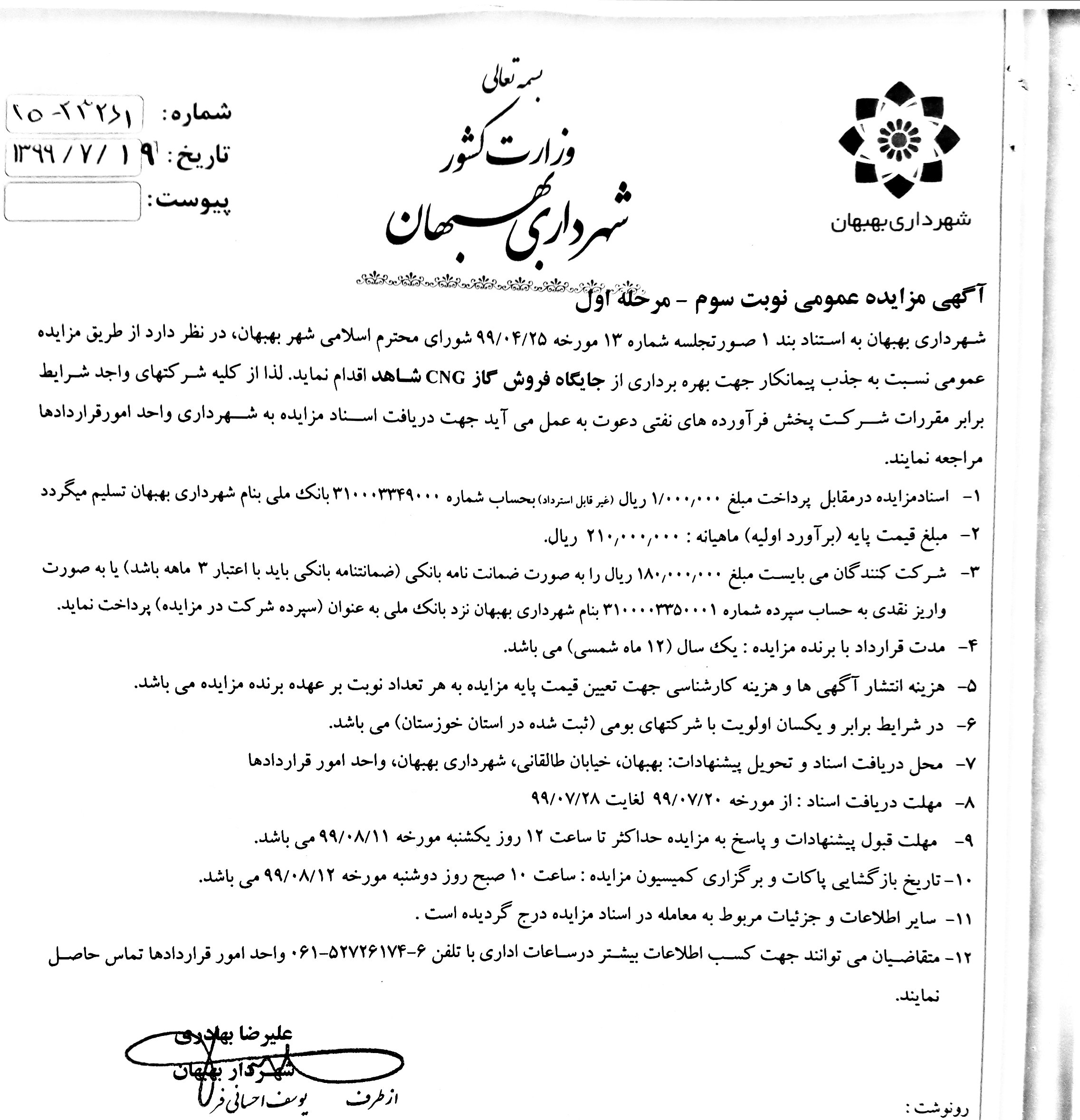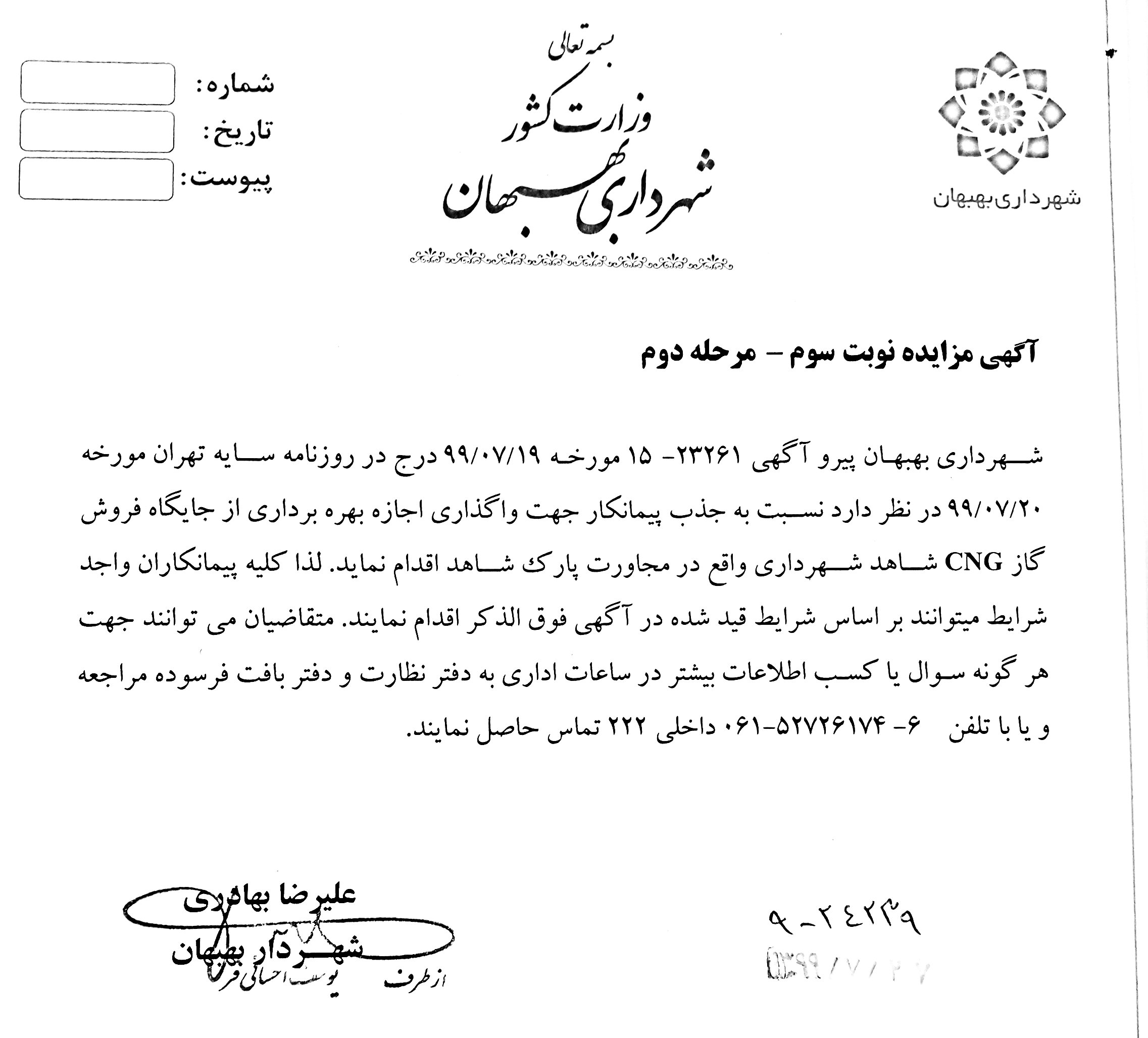 آگهی مزایده عمومی نوبت سوم- مرحله دومAdmin27 مهر 1399شهرداری بهبهان پیرو آگهی 23261-15مورخه99/07/19درج در روزنامه سایه تهران مورخه99/07/20درنظر د ارد نسبت به .شاهد شهرداری واقع در مجاورت پارک شاهد اقدام نماید.متقاضیان می توانند جهت ... ادامه مطلب