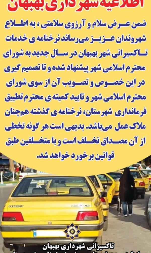 اطلاعیه شهرداری بهبهان ضمن عرض سلام و آرزوی سلامتی ، به اطلاع شهروندان عزیز میرساند نرخنامه ی خدمات تاکسیرانی شهر بهبهان در سال جدید به شورای ... ادامه مطلب