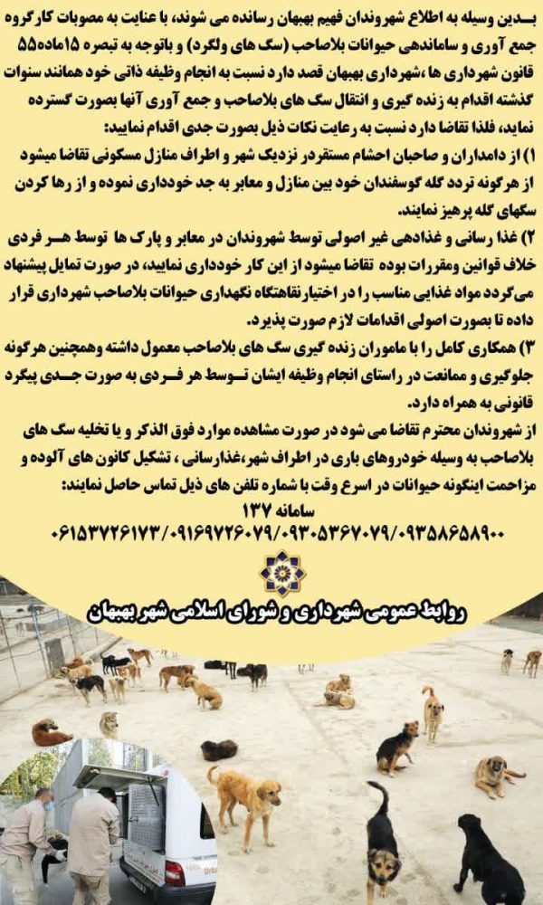 بسمه تعالی توجه توجه 🔽بدینوسیله به اطلاع شهروندان فهیم بهبهان رسانده میشوند، با عنایت به مصوبات کارگروه جمع آوری و ساماندهی حیوانات بلاصاحب (سگ های ولگرد) ... ادامه مطلب