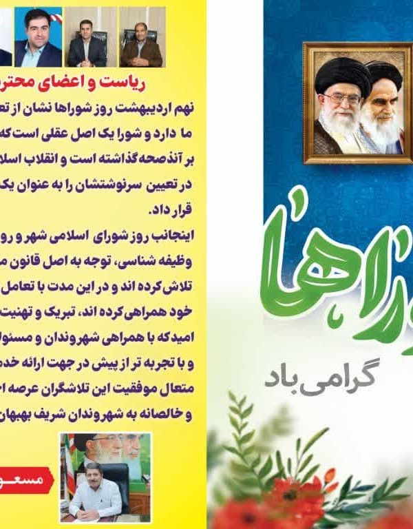 به گزارش روابط عمومی شهرداری و شورای اسلامی شهر بهبهان 🔽نهم اردیبهشت روز شوراها نشان از تعمیق مردم سالاری دینی در جامعه اسلامی ما دارد و ... ادامه مطلب