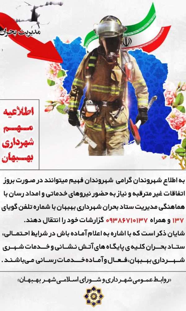 طلاعیه مهم شهرداری بهبهان 🔽به اطلاع شهروندان گرامی شهروندان فهیم میتوانند در صورت بروز اتفاقات غیر مترقبه و نیاز به حضور نیروهای خدماتی و امداد رسان ... ادامه مطلب